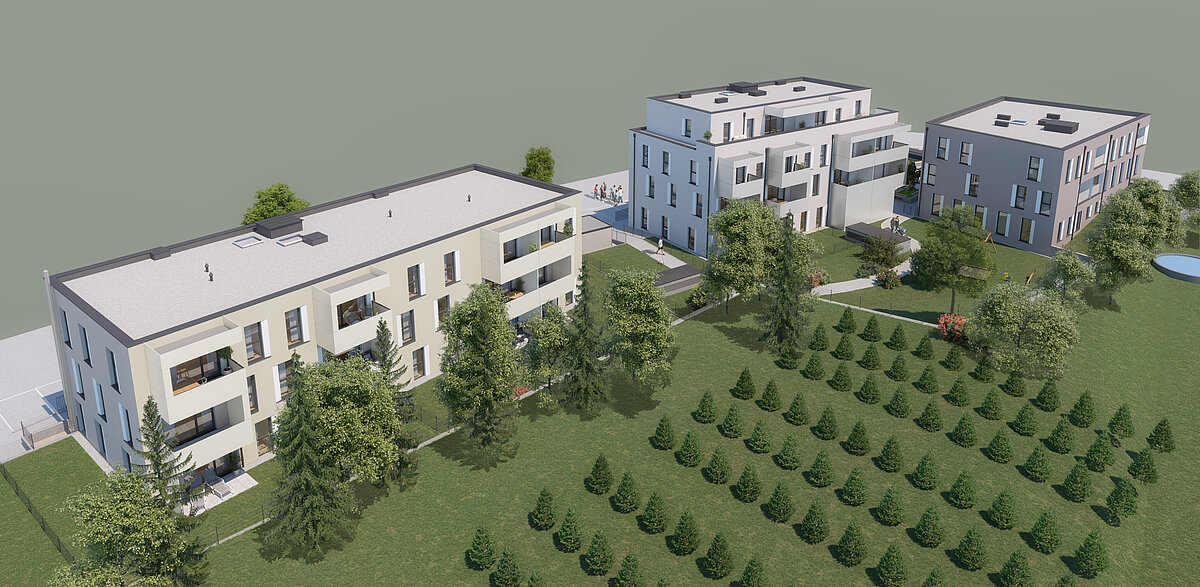 Die Wohnungen haben eine Größe zwischen ca. 42 m² und 96 m² und werden nach den Kriterien des anpassbaren Wohnbaues geplant. Jeder Wohneinheit ist eine Freifläche in Form von Loggia, Balkon Terrasse oder Dachterrasse zugeordnet. Die Erdgeschoßwohnungen von Haus 2 und 3 erhalten darüber hinaus einen zugeordneten Eigengarten. Die Beheizung der Anlage erfolgt mit einer zentralen Pelletsanlage, deren Heizzentrale in Haus 3 gelegen ist. Die Wärmeverteilleitungen für Haus 1 und 2 sind in der Tiefgarage situiert.