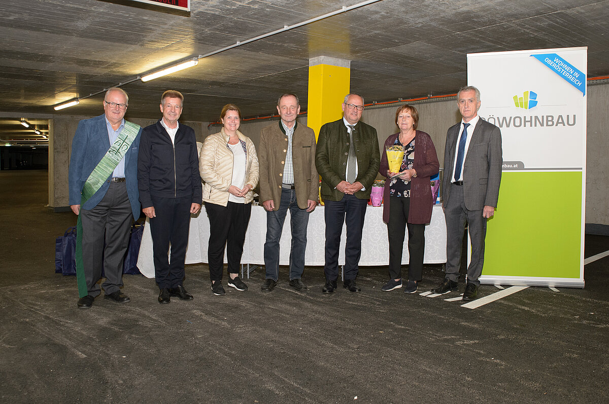 Am Bild: Diakon Josef Fuchs, Bgm. Albert Ortig, Edith Parzer, LAbg. Peter Bahn, Landtagspräsident Wolfgang Stanek mit Bewohnerin Frau Annemarie Parzer und Dr. Markus Rosinger, MSc (Geschäftsführer OÖ Wohnbau)