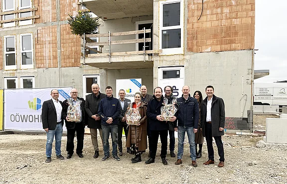 Am Bild v. l. n .re.: Franz Stallnig (Habau), Stefan Lennert (Gemeinde Asten), Christian Kastner, Polier Matthias Strasser, Peter Haas (Habau), Claudia Schaller, Bauleiter Bmst. Ing. Christoph Retschitzegger und Geschäftsführer Mag. Bernhard Baier (OÖ Wohnbau), Mag. Markus Fischer (F2 Architekten), Bauleiter Bmst. Ing. Jürgen Schlögl MBA, Projektleiter Ing. Mag. Roland Wagner (OÖ Wohnbau) sowie Katharina Seiringer (F2 Architekten).