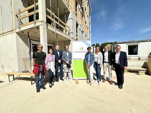 Am Bild v.l.n.r.: Ing. Mag. Werner Blaimschein, Mag. Martina Lauß und Bmst. Ing. Christoph Retschitzegger (OÖ Wohnbau), Mag. Arch. Markus Fischer (F2-Architekten ZT GmbH), Bürgermeisterin Mag. Doris Staudinger, Mag. Christina Haller und Bmst. DI Roland Schimpelsberger (GF Baufirma Haller), Ing. Dr. Jürgen Harich (GF OÖ Wohnbau)
