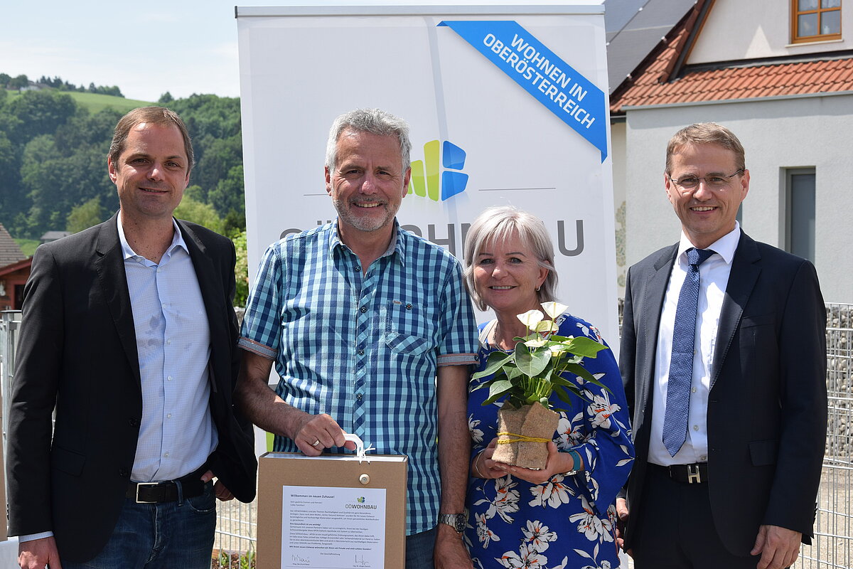 Am Bild v.l.n.re. Bürgermeister Mag. Rainer Barth BA MBA, die neuen Bewohner Herbert und Maria Hanetseder und Geschäftsführer Ing. Dr. Jürgen Harich